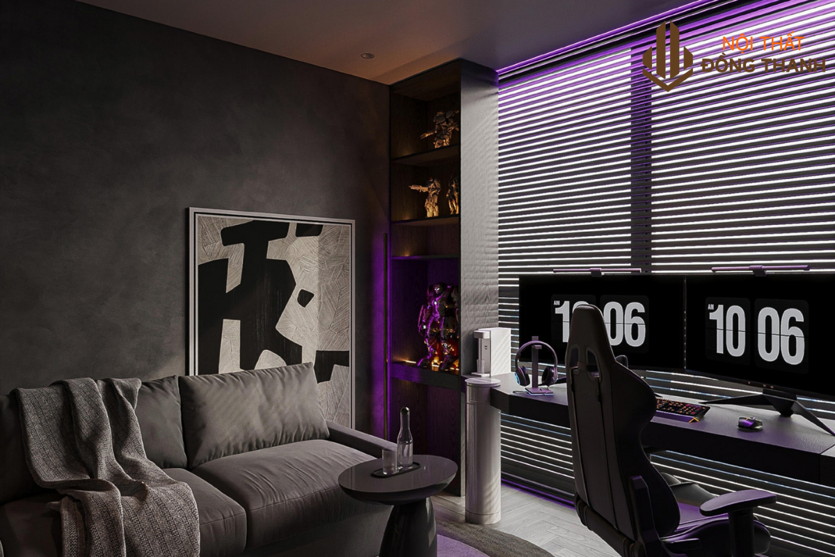 Có bàn học, giải trí và cửa sổ rèm kéo đơn giản