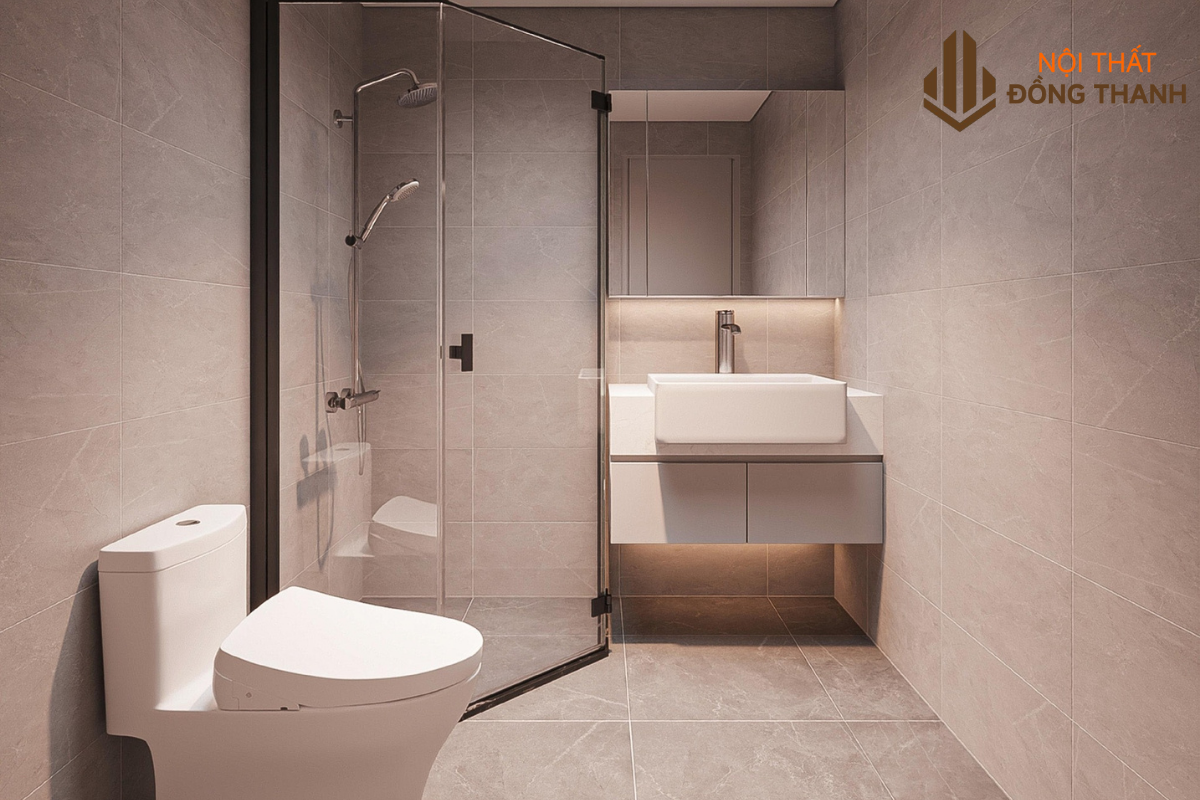 Các thiết bị vệ sinh hiện đại và hệ tủ lavabo âm giúp căn phòng luôn gọn gàng, sạch sẽ và tiện nghi – tạo nên cảm giác như đang tận hưởng dịch vụ tại một khách sạn cao cấp. Tone màu be sáng giúp không gian phòng tắm rộng rãi hơn.