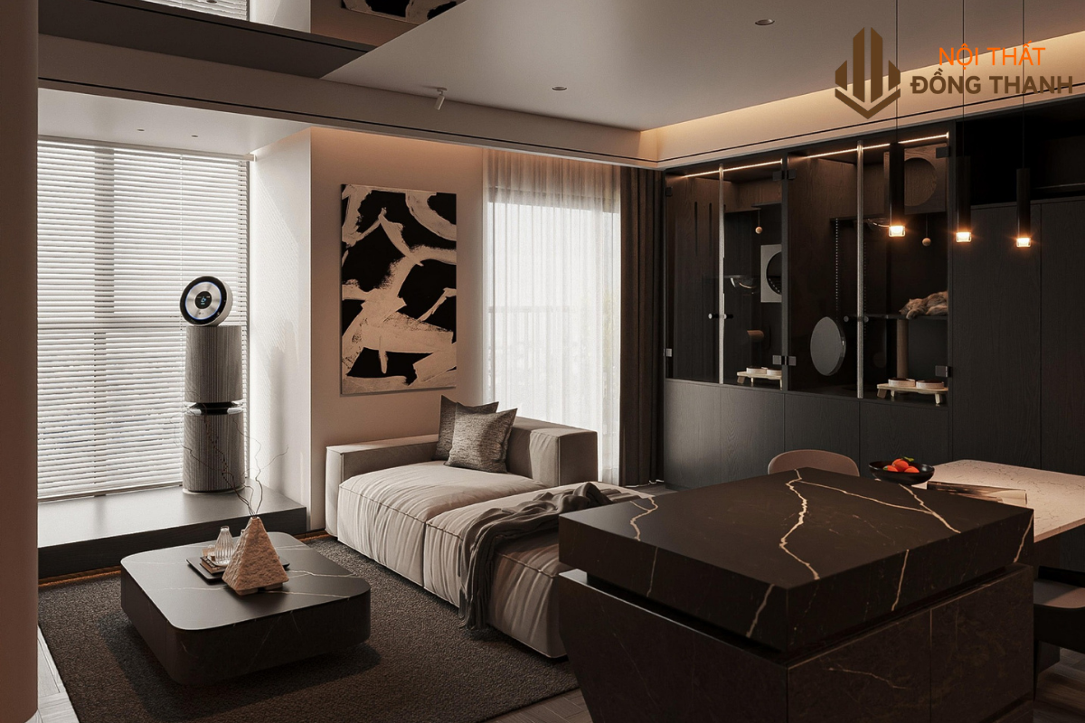 Phòng khách thiết kế với tone màu trầm chủ đạo